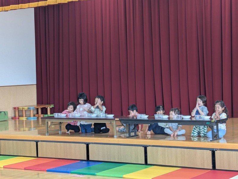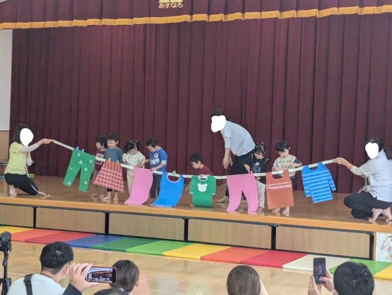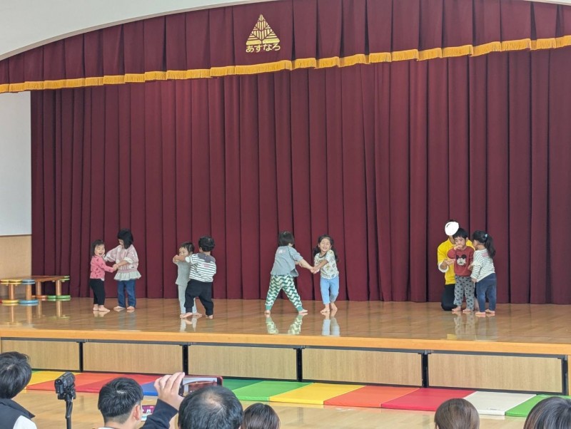 「にんじんとだんこんとごぼう」の昔話に沿って、お友だちや保育者とリズムに合わせて身体を動かしたり、カバンの始末や並ぶことなど、身の回りのできるようになったことを発表したり、歌ったりセリフをいうことにも挑戦しました。緊張や恥ずかしさもありながらも、しっかりステージに立って頑張る姿を保護者の方に見て頂くことができました。