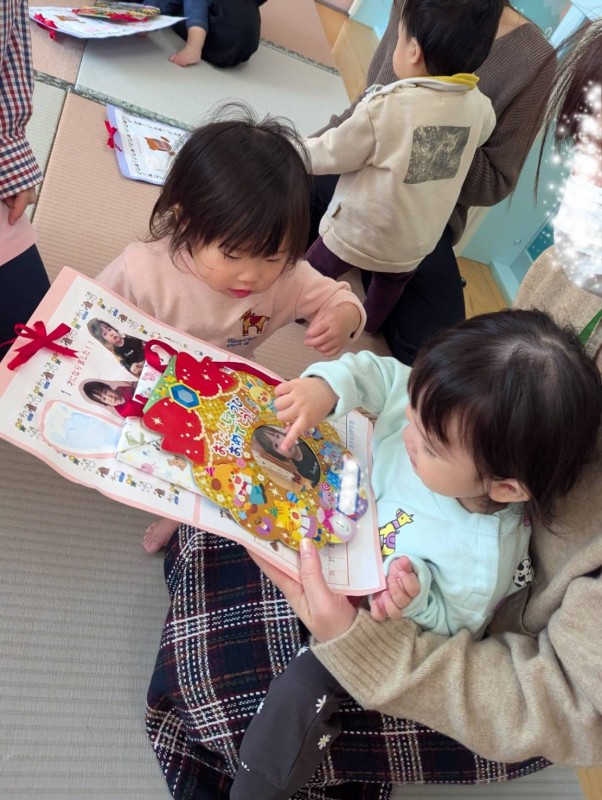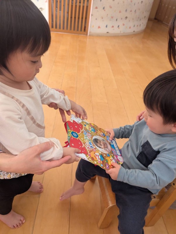 お家の方と一緒にお祝いをした後は、楽器遊びやおままごとをしたり、紙遊びをしたり、テラスに出て身体を動かして遊びました。お家の方やお友だち、保育者と楽しい時間を過ごしました。