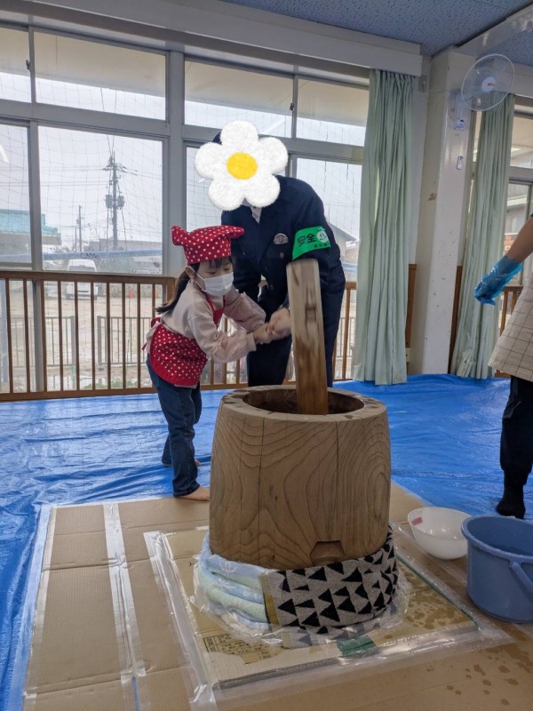 その後は5歳児さくら組さんがお巡りさんと一緒におもちつきをしました。重たい杵を力いっぱい振り下ろし、「よいしょ」と声をかけながらおもちをつく姿が見られました。日本の伝統行事に親しむ、貴重な経験となりました。