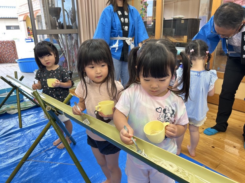 3歳児すみれぐみ・4歳児れんげぐみ・5歳児さくらぐみのお友だちは午後のおやつでそうめん流しをして楽しみました!!