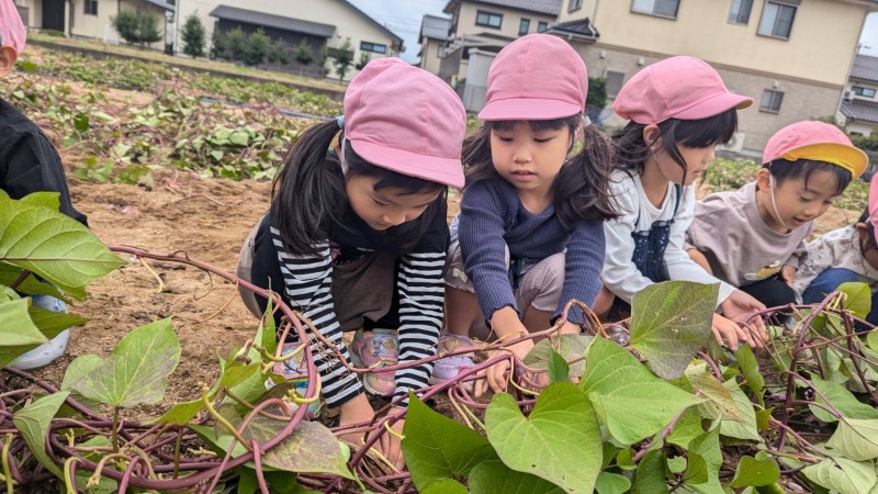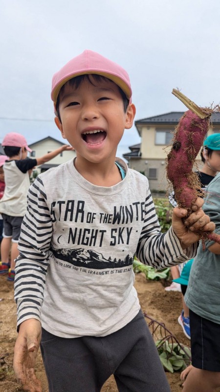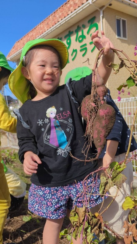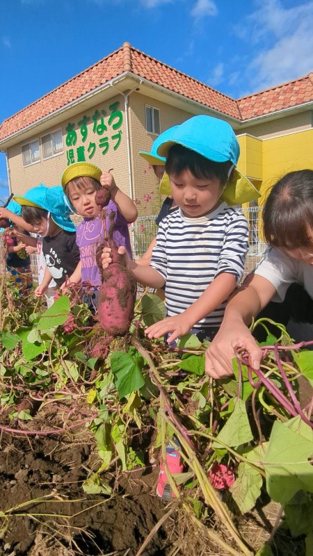 春に植えたさつまいもの苗がぐんぐん大きくなり、収穫の時期を迎えました。あすなろ保育園の広い畑でさつまいも掘りをしました。土の中からさつまいもが見えると「あった!」と大喜びのお友だち。力いっぱいつるを引っ張ったり、友だちと協力しながらたくさんのさつまいもを掘ることができました。いろいろな大きさ・形のおいもがあり、楽しんでさつまいも掘りができました。秋の実りを感じることができる良い機会となりました。おやつでふかし芋にしておいしくいただき「おいしい!」と大満足のお友だちでした。