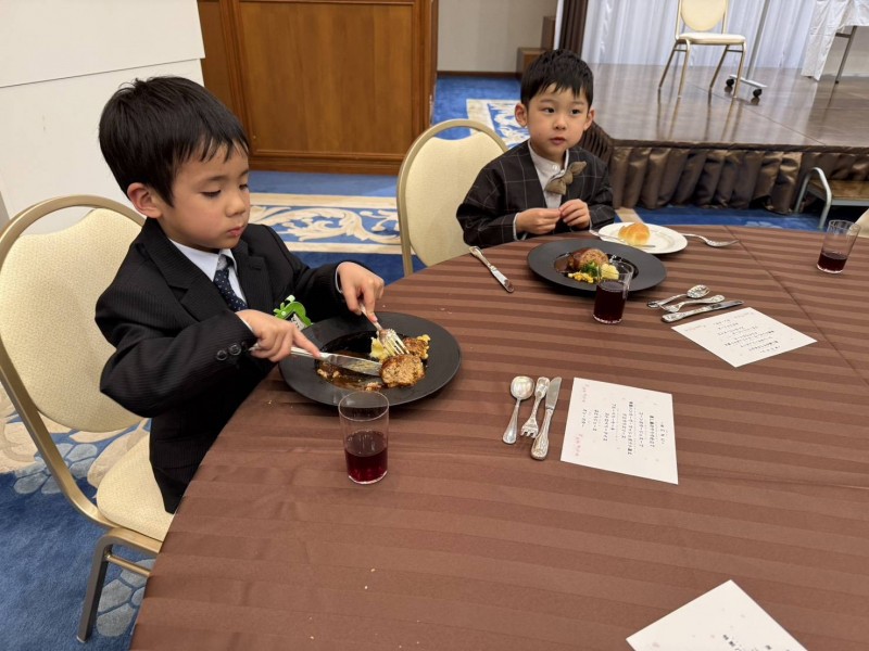 少し緊張しながらも、ナイフとフォークを上手に使って料理を味わい、いつもと違う特別な雰囲気の中で食事を楽しみました。