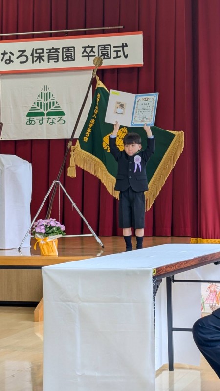 少し緊張した表情を見せながらも堂々と入場し、式では一人ひとりが名前を呼ばれて卒園証書を受け取りました。また、お別れのことばや歌を心を込めて歌い、会場は温かな雰囲気に包まれました。