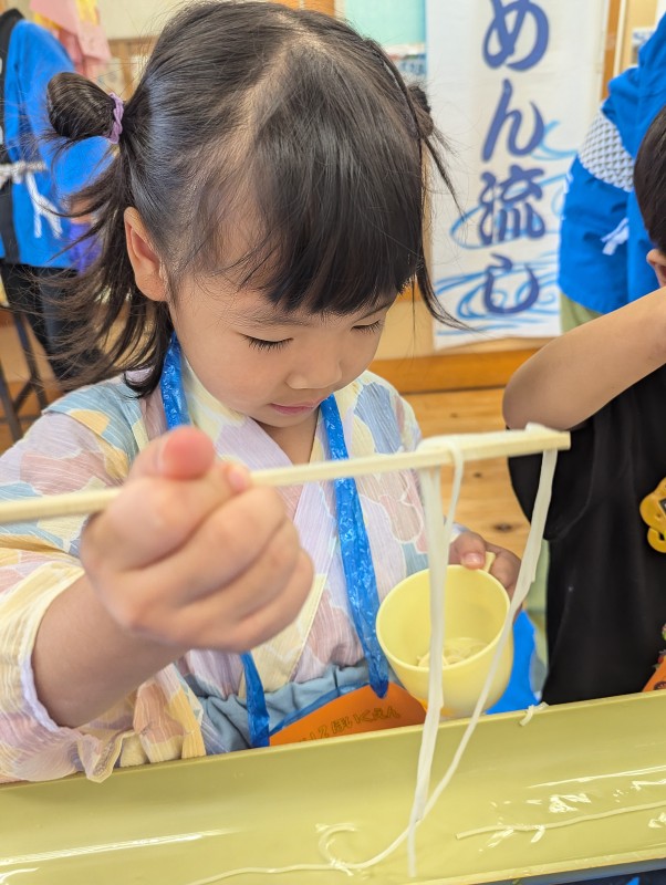 3歳児すみれぐみ・4歳児れんげぐみ・5歳児さくらぐみのお友だちは午後のおやつでそうめん流しをして楽しみました!!